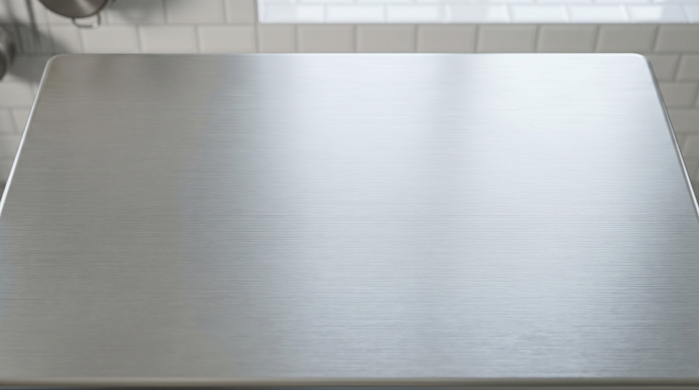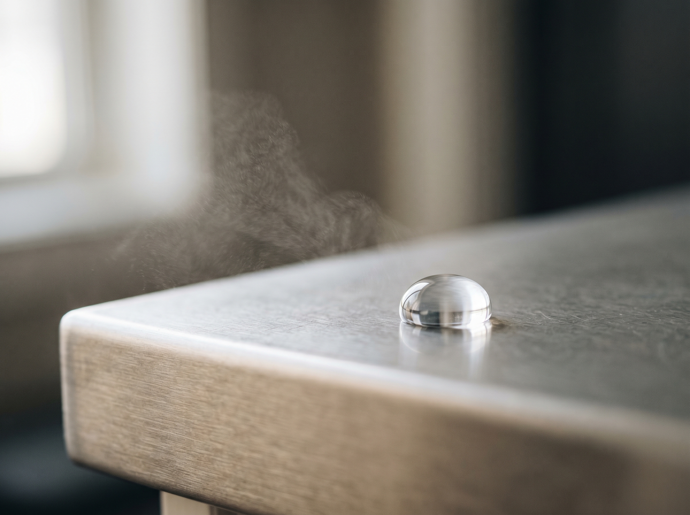 Left: a stainless-steel prep surface swabbed with live E. coli. Right: the same surface, thirty seconds after a single spray of aqueous ozone. Drag the handle.