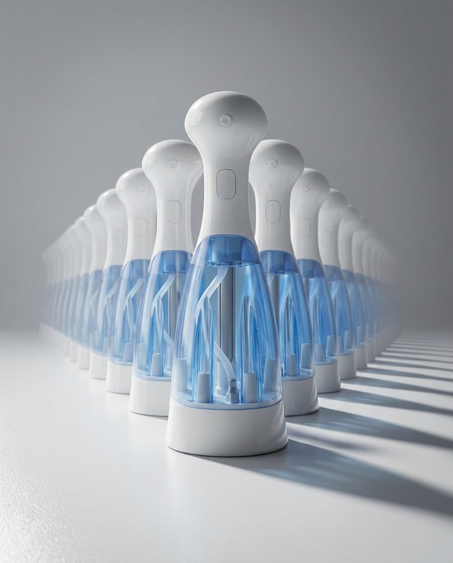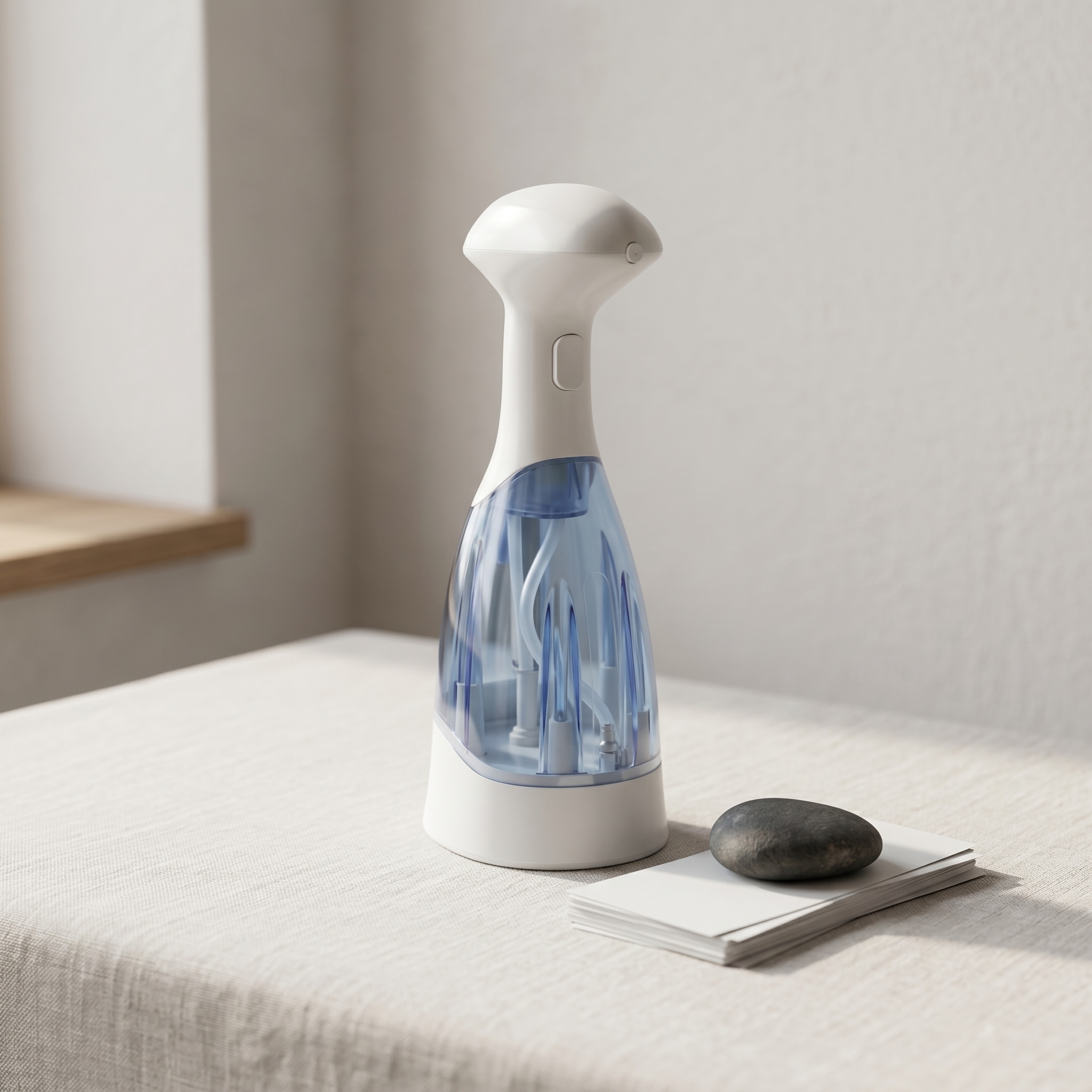 Fill the bottle with ordinary tap water and pull the trigger. Our patented ADEPT diamond cell turns it into aqueous ozone — a sanitizer that kills 99.9% of germs in 30 seconds, then reverts to pure water and oxygen.