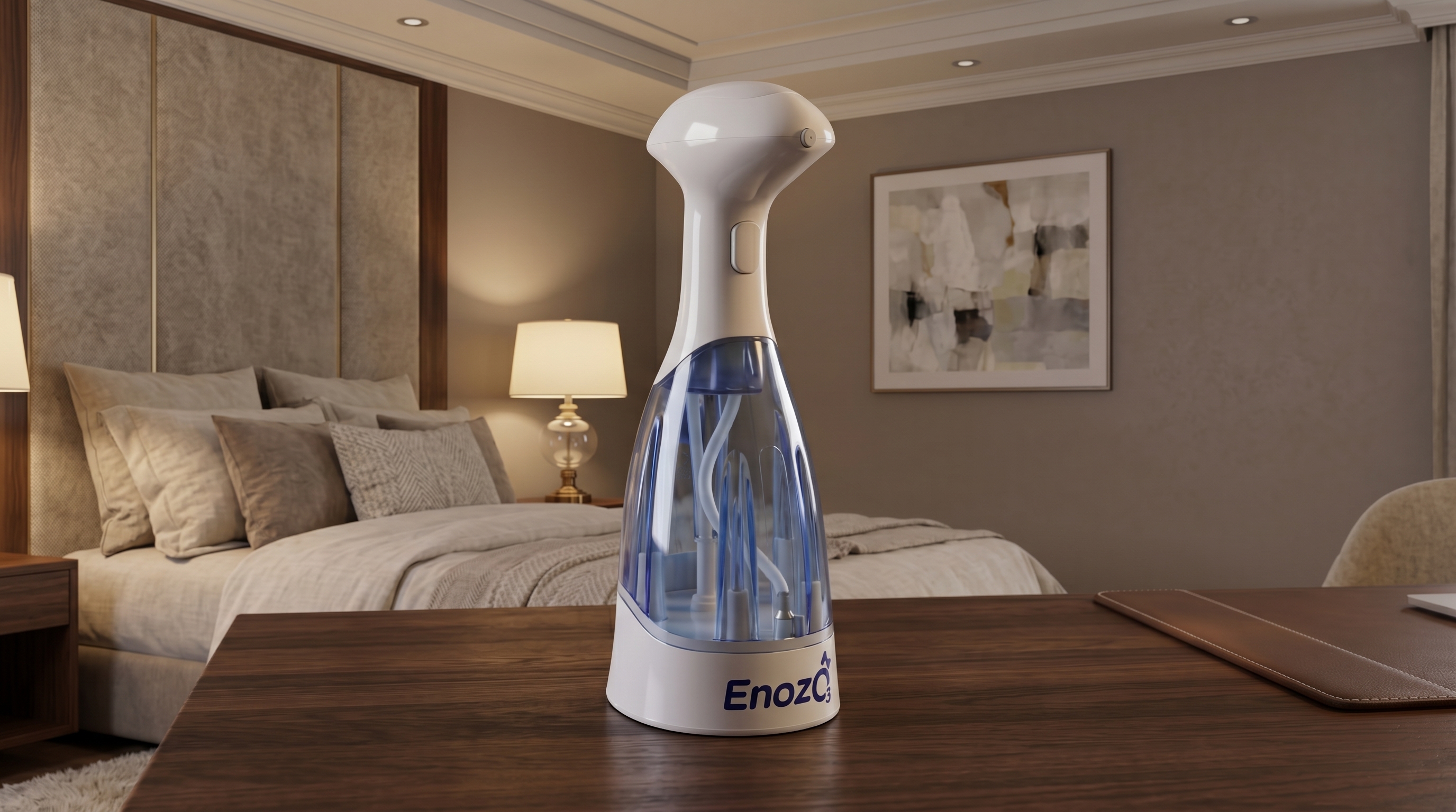 From a hotel housekeeping cart to a 10,000-sq-ft warehouse floor — every Enozo device runs the same aqueous ozone process. Pick the form factor, not the chemistry.